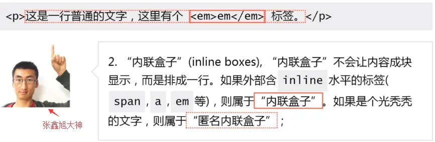 2、内联盒子(inline boxes),内联盒子不会让内容成块显示,而是排成一行。如果(文字)外部包含inline水平的标签(span、a、em、strong等),则属于内联盒子。如果是个光秃秃的文字,则属于匿名内联盒子。图示会更清楚: