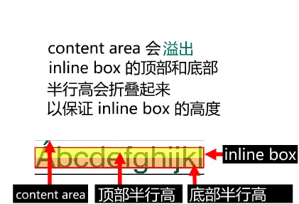 行高决定内联盒子的高度;行间距墙头草,可大可小(甚至负值),保证高度正好等于行高。行间距为负值时,举例说明,在simsun字体下,如果line-height小于font-size,inline box会优先于行高,以保证inline box的高度正好等于行高。例:font-size: 16px; line-height: 12px; inline box高度为12px。content area会溢出,inline box的顶部和底部半行高会折叠起来,以保证inline box的高度。图示如下:
