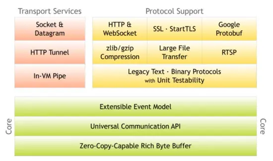 - 协议方面的支持有:基于原始文本和二进制的协议;解压缩;大文件传输;流媒体传输;protobuf编解码;安全认证;http和websocket