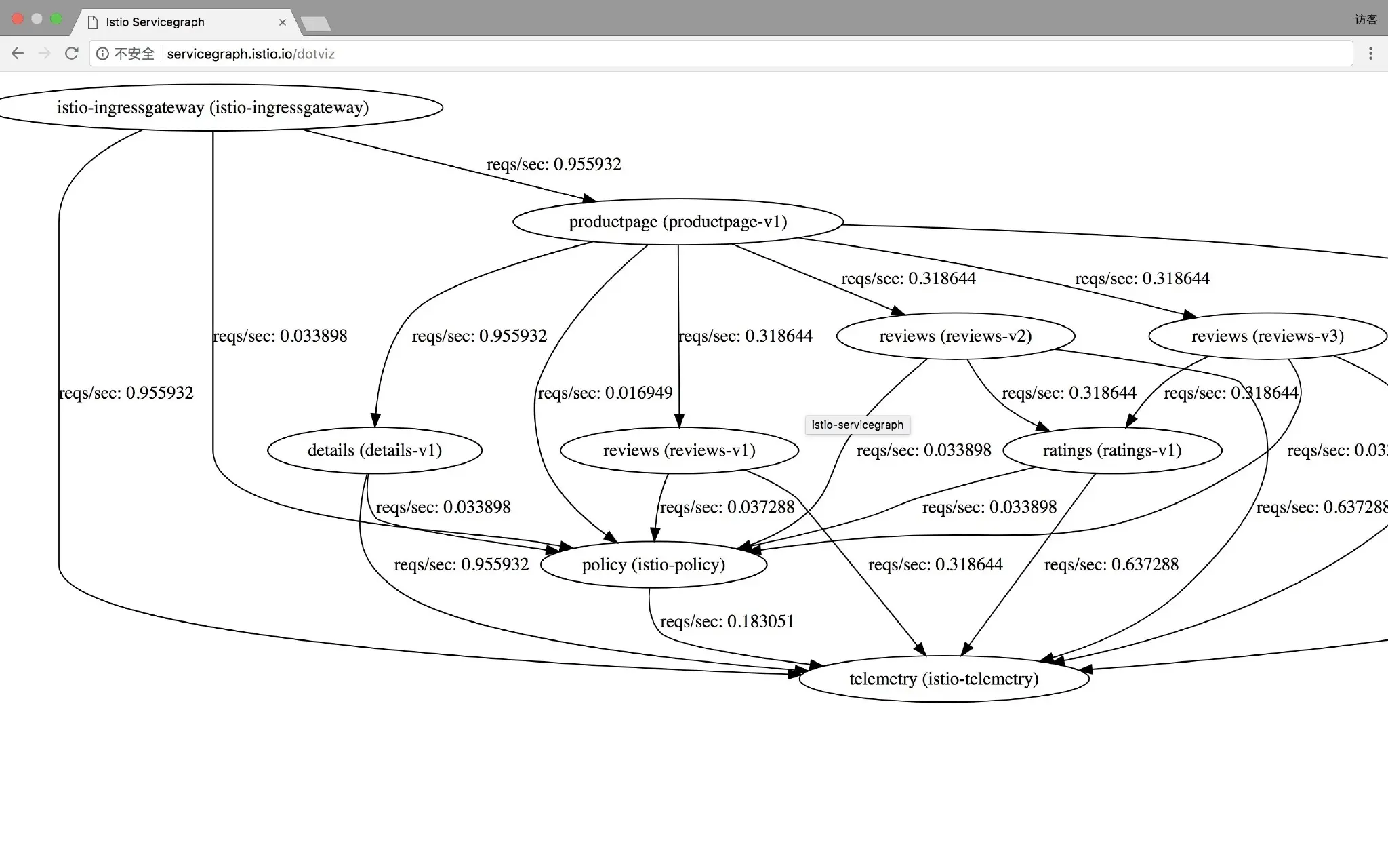 通过 http://servicegraph.istio.io 访问 ServiceGraph 服务,展示服务之间调用关系图。