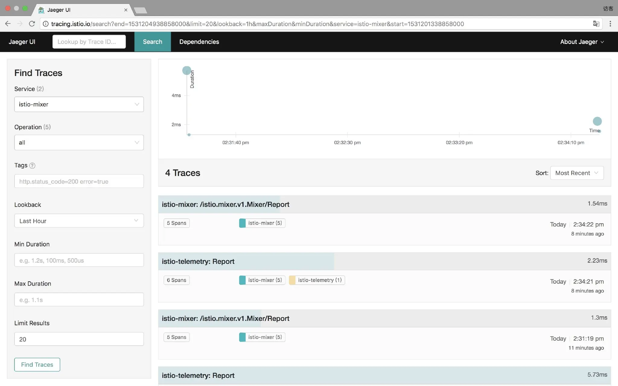 通过 http://tracing.istio.io/ 访问 Jaeger 跟踪页面: