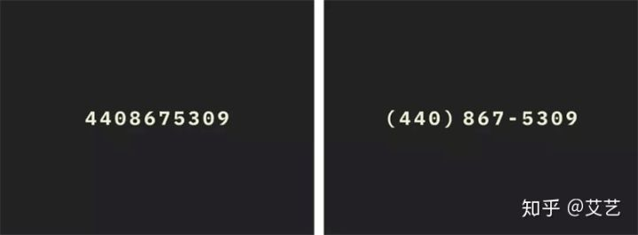 对电话号码的组块就是最典型的例子。组块前,电话号码只是一长串数字,理解和记忆的难度高,而组块后的电话号码就十分容易被理解和记忆。「满屏文本」 常常为用户带来困扰,组块可以合理区分标题,并恰当地处理句子和内容的长度,解决这一问题。