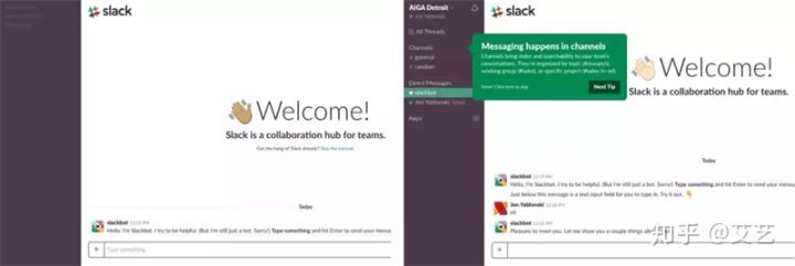 新手引导页是一个至关重要但高风险的流程,Slack 把这件事完成地很好。常见的引导页设计,用户必须忍受几张幻灯片后才可进入系统。而 Slack 则是使用机器人(Slackbot)通过低成本地消息推送来引导用户。为防止新用户感到负担过重,Slack 隐藏了消息推送以外的所有功能。一旦用户学会了如何通过 Slackbot 发消息后,就会逐渐被引入其他的功能中。