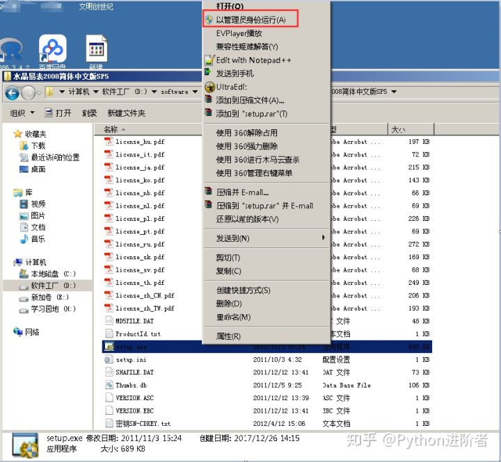3、找到水晶易表的安装包,找到Setup.exe文件,然后右键以管理员身份运行,如下图所示。