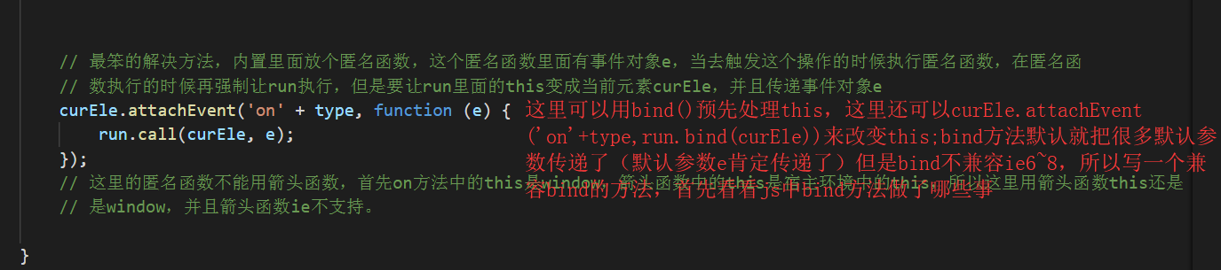 // e:事件对象,不同于DOM0事件绑定,使用attachEvent绑定方法,当事件触发方法执行的时候,浏览器也会