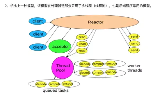 Accept连接和读写操作也可以使用同一个线程池来进行处理。而请求处理逻辑既可以使用单独的线程池进行处理,也可以跟放在读写线程一块处理。线程池中的每一个线程都是NIO线程。用户可以根据实际情况进行组装,构造出满足系统需求的高性能并发模型。