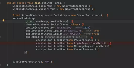 4、5、创建处理网络事件的ChannelPipeline和handler,网络时间以流的形式在其中流转,handler完成多数的功能定制:比如编解码 SSl安全认证