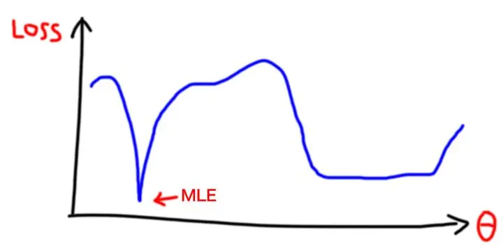 由于 MLE 只看最大概率,它可能走入一个深而窄的谷里面,这往往就是过拟合。很多文章也提到过,"平坦"的局部极小值,可能比全局最小值更好。