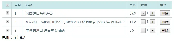 购物车一般包含商品名称、单价、数量等信息,数量可以任意新增或减少,商品项也可删除,还可以支持全选或多选: