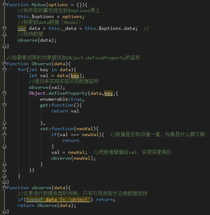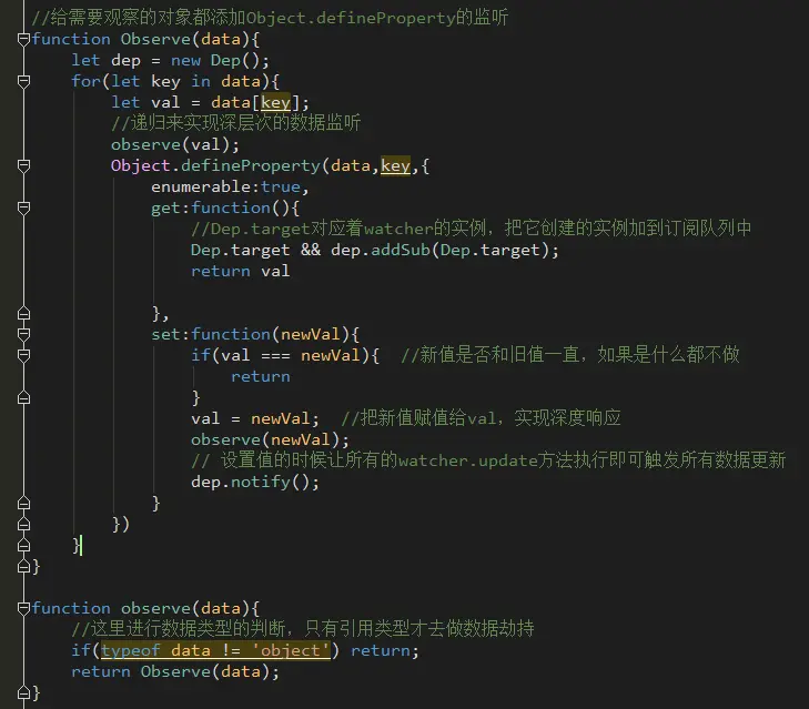 - Observe实现了对数据的监听,多写一个observe的小方法用来new Observe,并且在里面做了引用数据类型的判断。这样做的目的是为了方便递归来实现数据结构的深层监听。