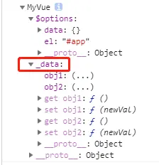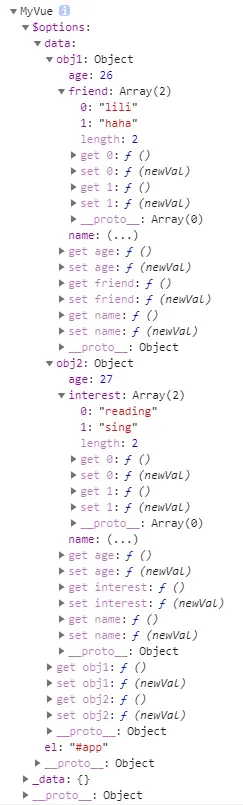 可以看到对我们所定义的data中的数据都已经有了get和set方法了,到这里我们对data中数据的变化都是可以监听的到了。
