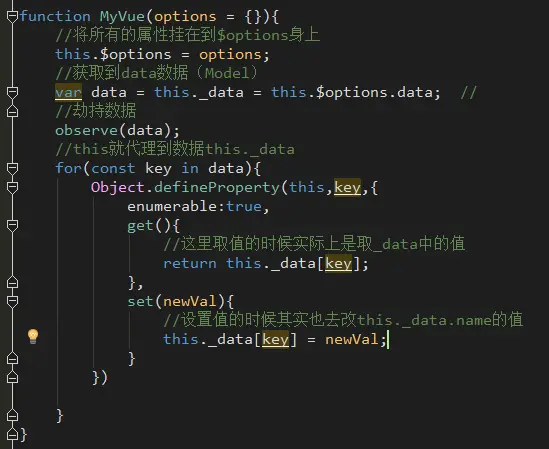 下面我们来实现让我们的实例this来代理( _data)数据,从而实现 myvue.name 这样的操作可以直接获取到数据。