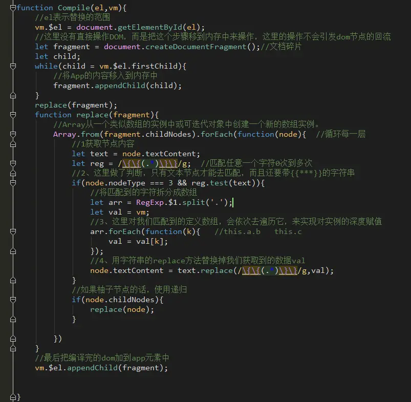 - 获取到数据后,用replace方法替换掉文本中{{}}的整块内容,然后在放回el元素中vm.$el.appendChild(fragment)。