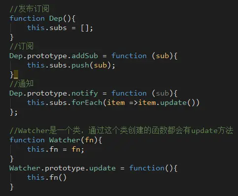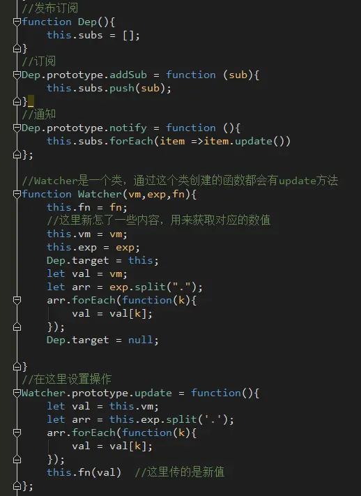 这里用Dep方法来实现订阅和通知,在这个类中有addSub(添加)和notify(通知)两个方法,我们把将要做的事情(函数)通过addSub添加进数组里,等时机一到就notify通知里面所有的方法执行。