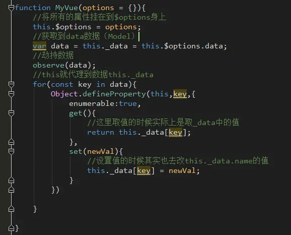 - 先定义初始化构造函数MyVue,通过它来获取我们传进来的数据data和定义的DOM节点范围,然后把data传进定义好的数据劫持方法observe。