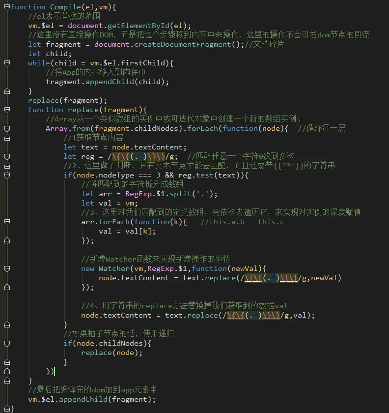 把定义函数的方法watcher加到了replace方法里面,但是这里的watcher跟刚写编写的多了两个形参vm、RegExp.$1,而且写法也新增了一些内容,因为当new Watcher的时候会引发发生几个操作,来看完整代码: