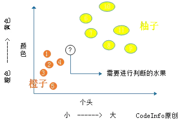 假设有一个水果(橙子或者柚子), 如何判断它是橙子或者柚子呢? 这时大脑思维过程一般类似:存在一个水果特征图表,假设个头越大、颜色越黄的就是柚子,如下图,然后会判断该神秘水果特征最接近橙子或者柚子,最接近的就是该水果的种类。