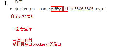 - docker run --name 容器名 -d -p 3306:3306 mysql docker 启动容器
