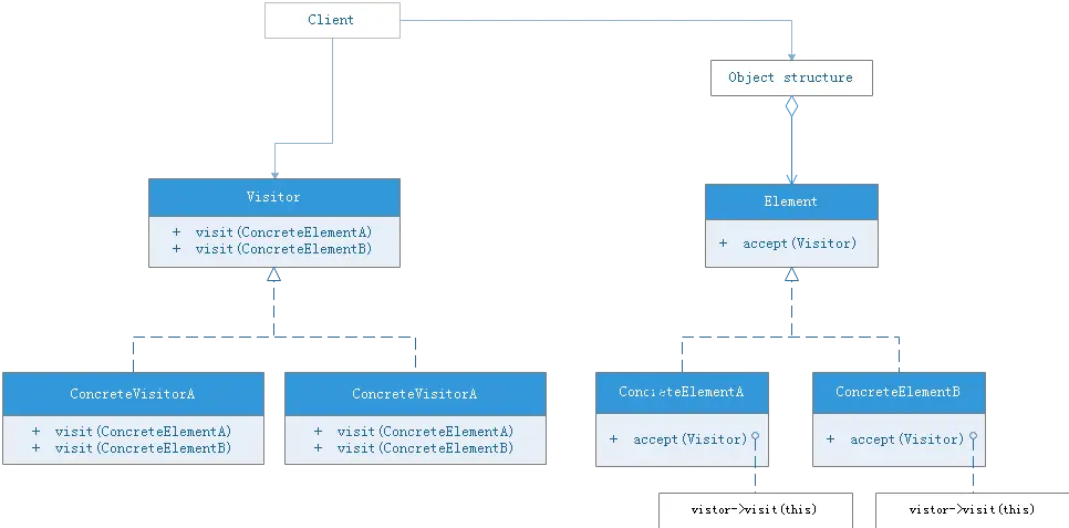抽象访问者(Visitor): 声明出对对象结构中每一个具体元素的访问方法visit,传入Concrete Element对象作为参数