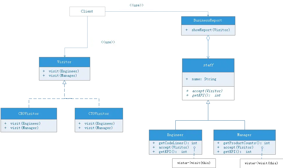 公司对员工进行考核,员工存在工程师和产品经理,考核的评审有CEO和CTO,CTO只关注工程师的代码量和产品经理的新产品数量。而CEO则关注工程师的KPI和产品经理的KPI及新产品数量。从这边可以看出CEO和CTO对员工考核的关注点不一样,这就需要对员工类型进行处理,就可以用到访问者模式(员工分类结构也是很稳定不变的)。(来自<<Android源码设计模式解析与实践>>)