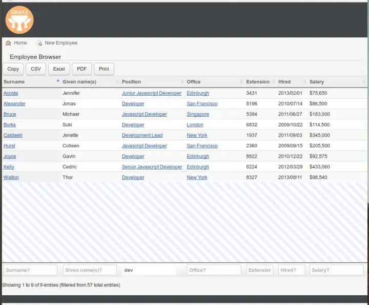 但该员工信息浏览器功能也是有限的。例如,如果想查找 “position” 信息中包含 “dev” 的员工该怎么办?如果要组合排序,以姓氏为主排序关键字,“office” 为辅助排序关键字,该怎么办?或者,你需要将已排序的数据导出到电子表格或 PDF 文档以便通过电子邮件发送给无法访问浏览器的人,该怎么办?