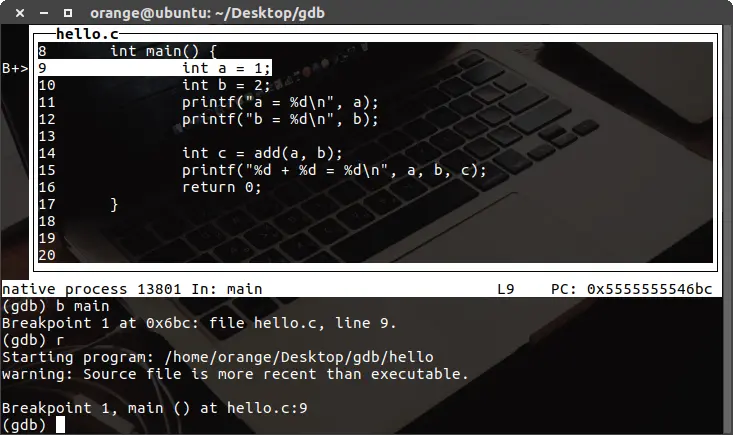 在 gdb 中使用命令 print var 或简写 p var 来打印一个变量或者函数的返回值,我们在第 10 行 int b = 2; 添加一个断点:
