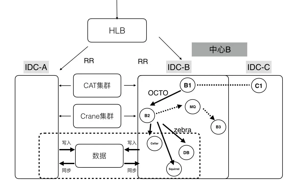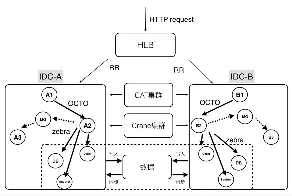 上图是比较典型的美团技术体系下的分布式系统结构:依托了美团公共组件和服务,完成了分区扩容、容灾和监控的能力。前端流量会通过 HLB 来分发和负载均衡;在分区内,服务与服务会通过 OCTO 进行通信,提供服务注册、自动发现、负载均衡、容错、灰度发布等等服务。当然也可以通过消息队列进行通信,例如 Kafka、RabbitMQ。在存储层使用 Zebra 来访问分布式数据库进行读写操作。利用 CAT(美团开源的分布式监控系统)进行分布式业务及系统日志的采集、上报和监控。分布式缓存使用 Squirrel+Cellar 的组合。分布式任务调度则是通过 Crane。