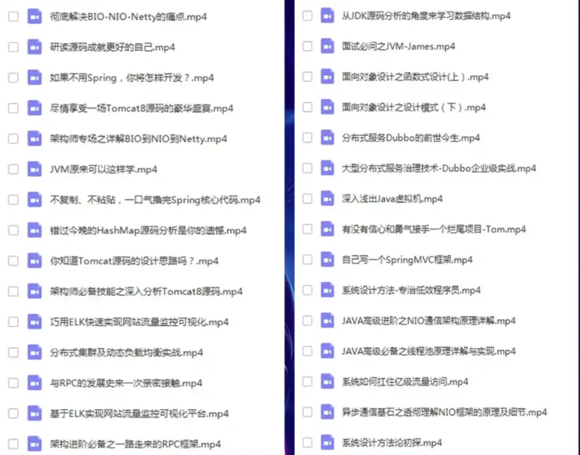 推荐一个交流学习圈子群:697-57-9751 里面会分享一些资深架构师录制的视频录像:有Spring,MyBatis,Netty源码分析,高并发、高性能、分布式、微服务架构的原理,JVM性能优化这些成为架构师必备的知识体系。还能领取免费的学习资源,目前受益良多:
