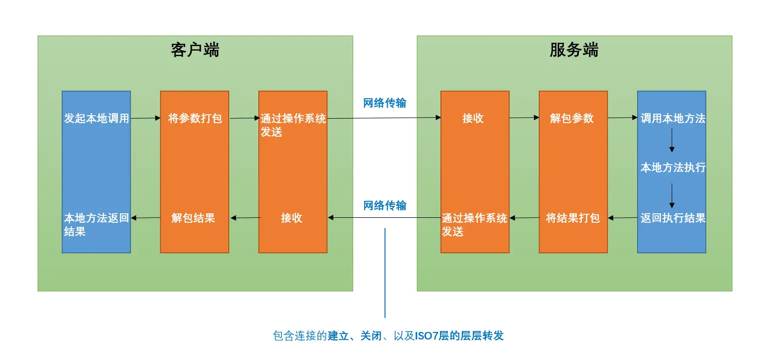 网络连接的是处于不同物理位置上的节点,学过物理和数学你的应该明白,两点之间是存在“距离”的,而我们的分布式系统需要在这个距离之上进行数据的传递,本质上就是物质的传递。同时应该你也知道,物质的运动速度不会超过光速。所以,不同节点之间的通信是需要经过一段时间的,也就意味着会存在延迟。具体的延迟是由所用的传输介质、节点当前的负载大小所决定的。另外,不容被忽视是为了通讯所做的额外工作也是耗时的,而且还不小,下图的橙色部分就是为了两个远程节点的通讯额外做的事情。
