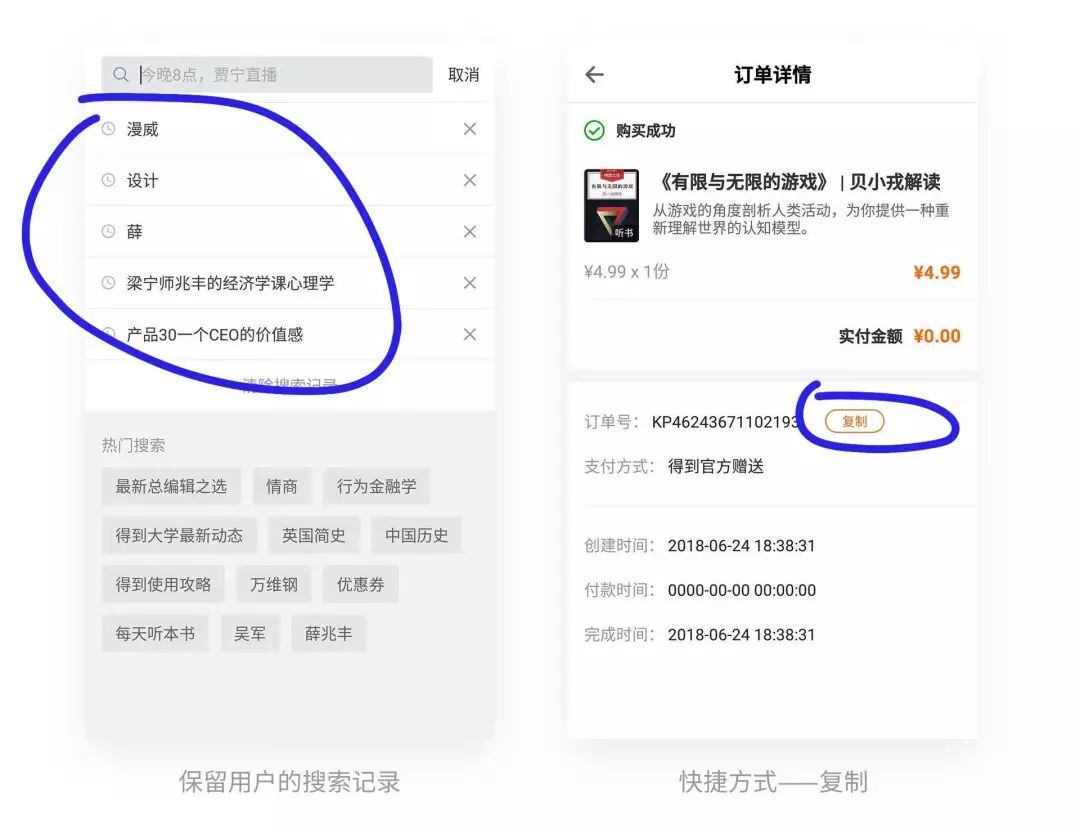 右图点击复制按钮即可将订单号复制成功,不会让用户去强行记忆这串长长的数字,也不必长按订单号去复制,节省时间精力。