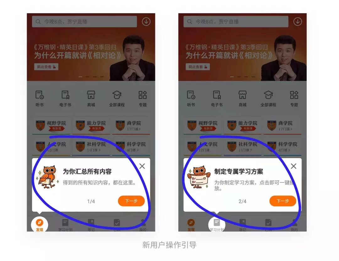 用户新安装App的时候,会有新手操作引导告知使用方法,老司机用户可按照引导一步一步了解产品,小白用户可以点击右上角“X”跳过。