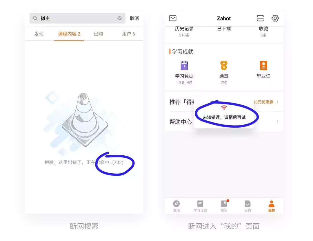 左图是在断网状态下进行搜索时出现的提示,用趣味性的图标和文字提示固然值得学习,但是谁能告诉我702是啥意思,要702秒后抢修好?要点击702下能抢修好?要交702块钱能抢修好?我猜猜猜猜猜猜…