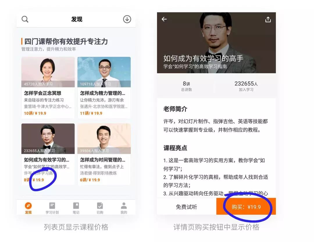 用户在列表页看完课程后,进入详情页面可以再次向用户展示价格信息,让用户心中有谱。