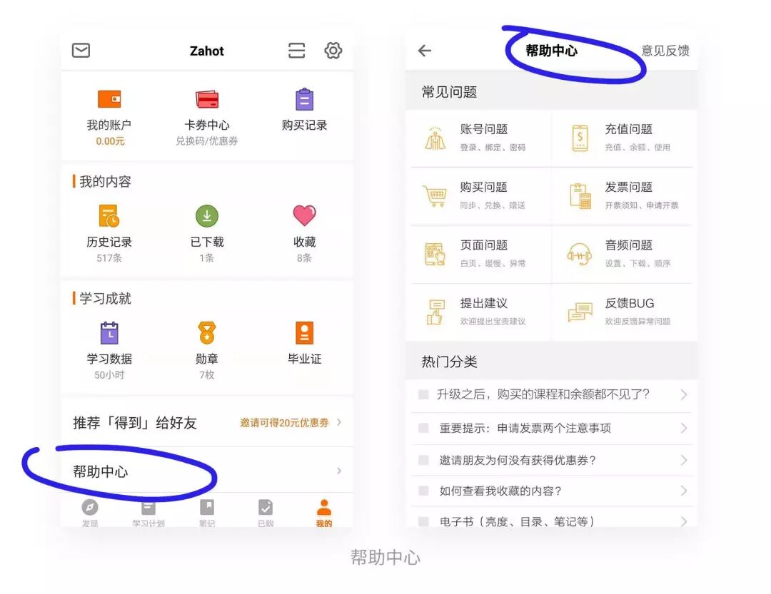 左图,得到APP将帮助中心放在我的页面,用户很容易找到,还算有点良心。而有些APP将帮助入口隐藏得很深,就怕用户找到。
