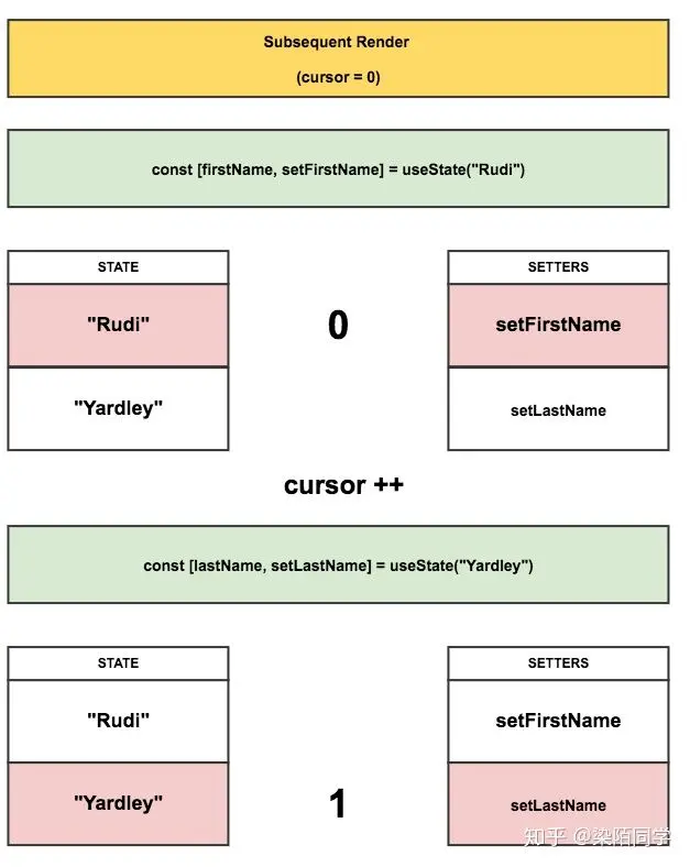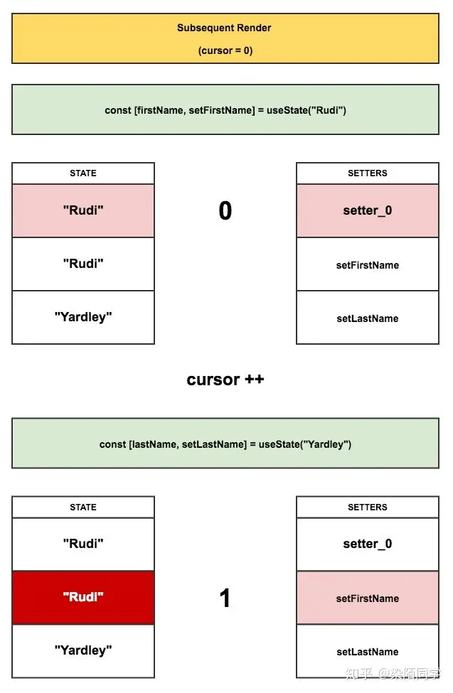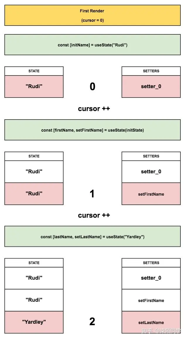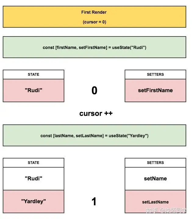 每当 useState() 被调用时,如果它是首次渲染,它会通过 push 将一个 setter 方法(绑定了指针“cursor”位置)放进 setters 数组中,同时,也会将另一个对应的状态放进 state 数组中去。