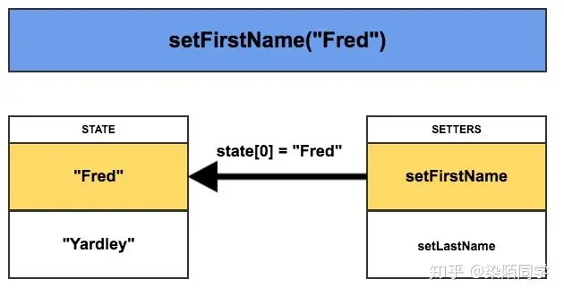 每个 setter 都会有一个对应的指针位置的引用,因此当触发任何 setter 调用的时候都会触发去改变状态数组中的对应的值。