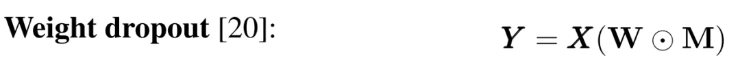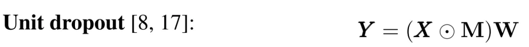 我们的研究工作使用了两种最流行的伯努利 Dropout 技术,即 Hinton 等人提出的单元 Dropout [8, 17] 和 Wan 等人提出的权重 Dropout[20]。对于全连接层,若输入张量为 X、权重矩阵为 W、输出张量为 Y、Mask 掩码 M_io 服从于分布 Bernoulli(α),那么我们可以定义这两种方法为: