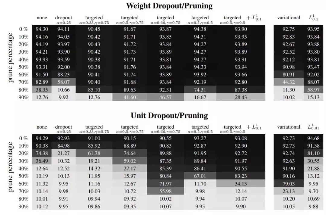 但是如果这些较小的值在训练中变得更重要,那么它们的数值应该是增加的。因此,通过利用靶向比例γ和删除概率α,研究者将随机性引入到了这个过程中。其中靶向比例(targeting proportion)表示我们会选择最小的γ|θ|个权重作为 Dropout 的候选权值,并且随后以丢弃率α独立地去除候选集合中的权值。