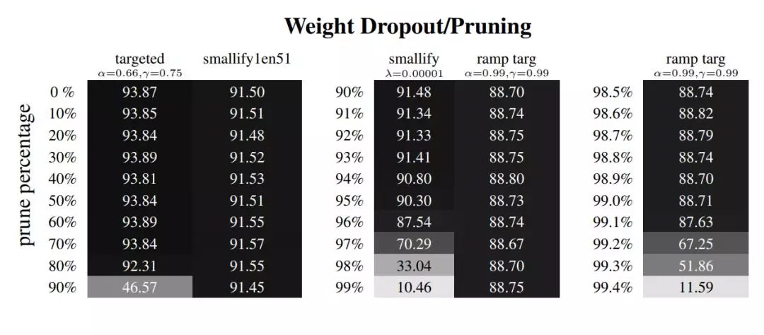 表 2:比较 Targeted Dropout 和 ramping Targeted Dropout 的 Smallify。实验在 CIFAR-10 上使用 ResNet-32 完成。其中左图为三次 targeted 中最好的结果与 6 次 smallify 中最好结果的对比,中间为检测出最高的剪枝率,右图为 ramp targ 检测出的更高剪枝率。