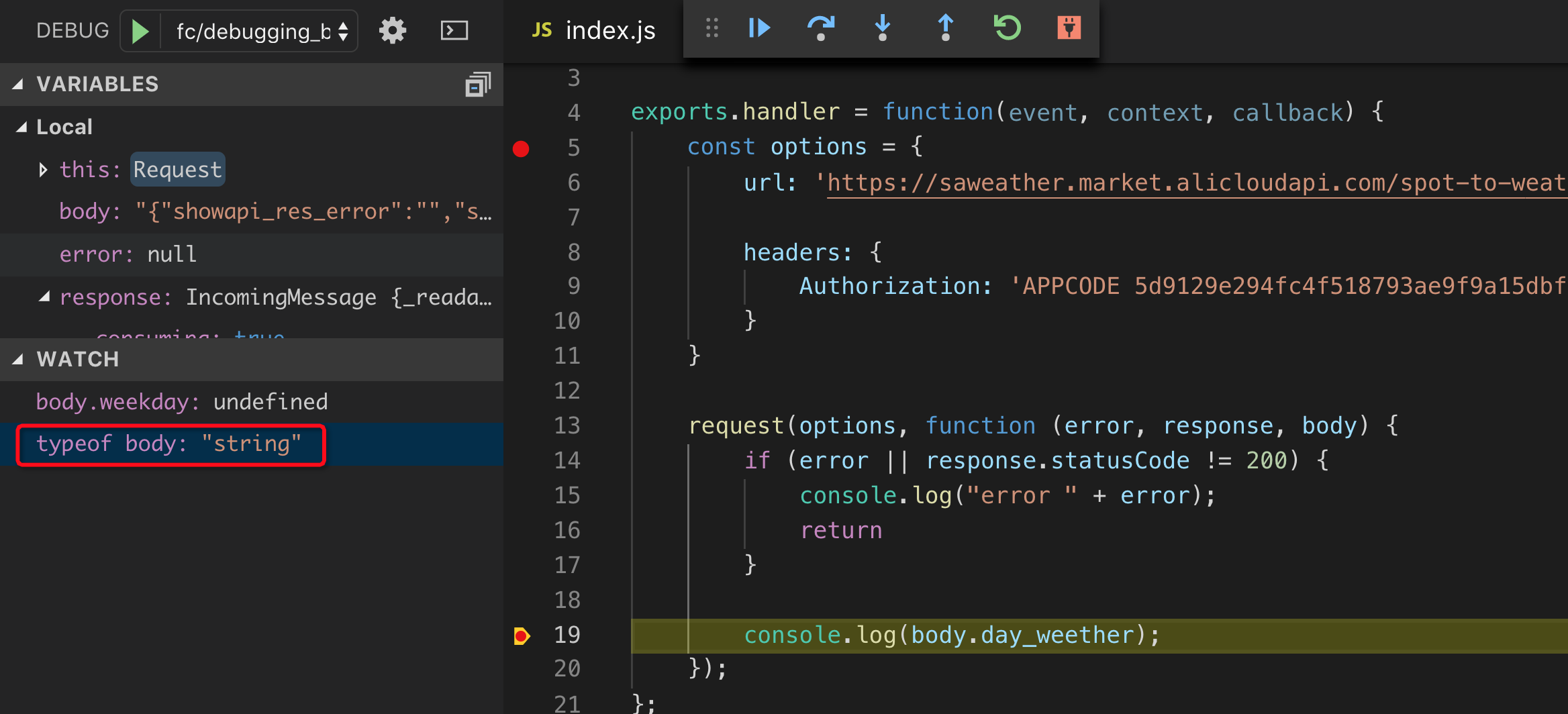 然后使用以下命令将函数以调试的方式运行起来(调试基本用法 参考,这里不再过多阐述):