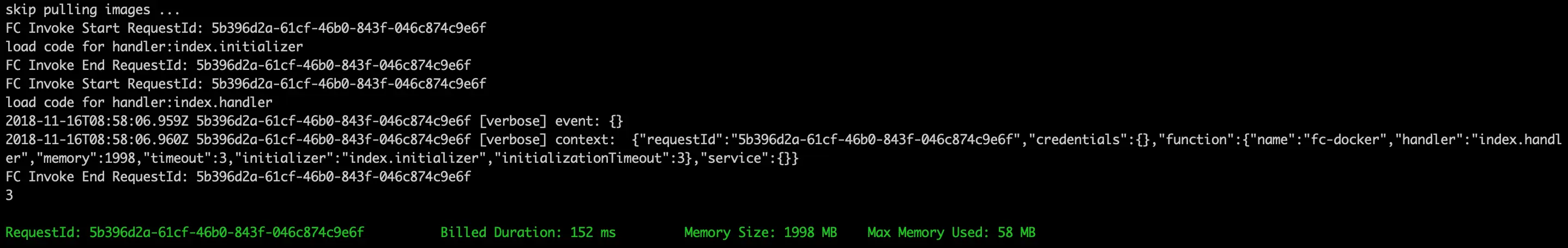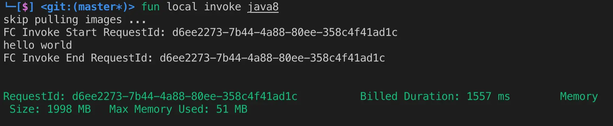 fun local invoke -d 3000 nodejs8