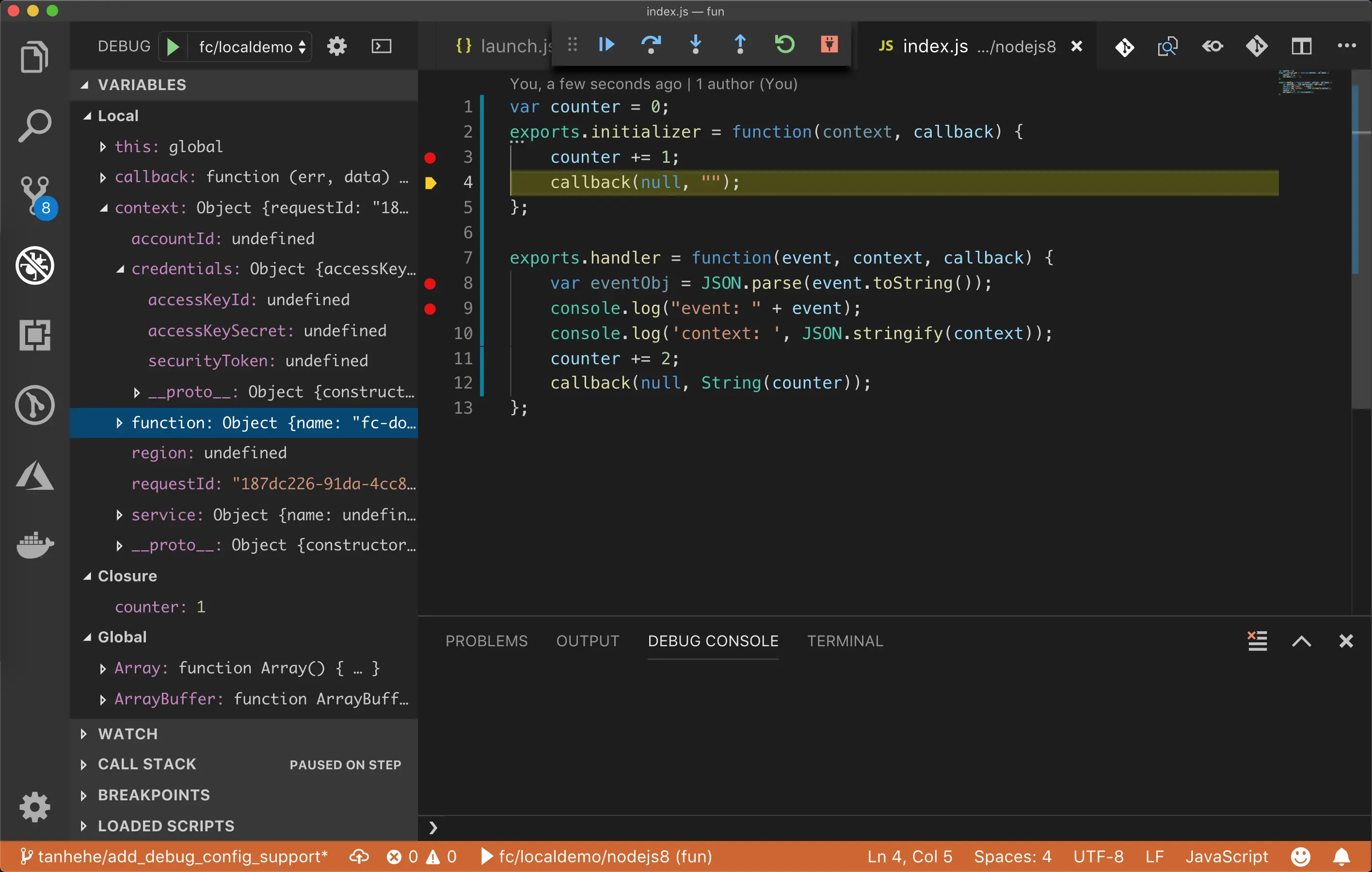 以下是一个 nodejs8 函数本地单步调试的流程例子: