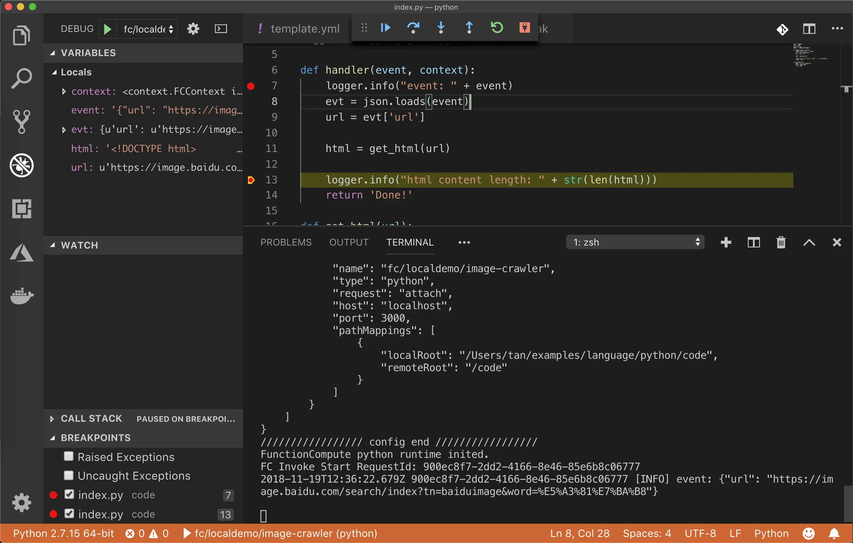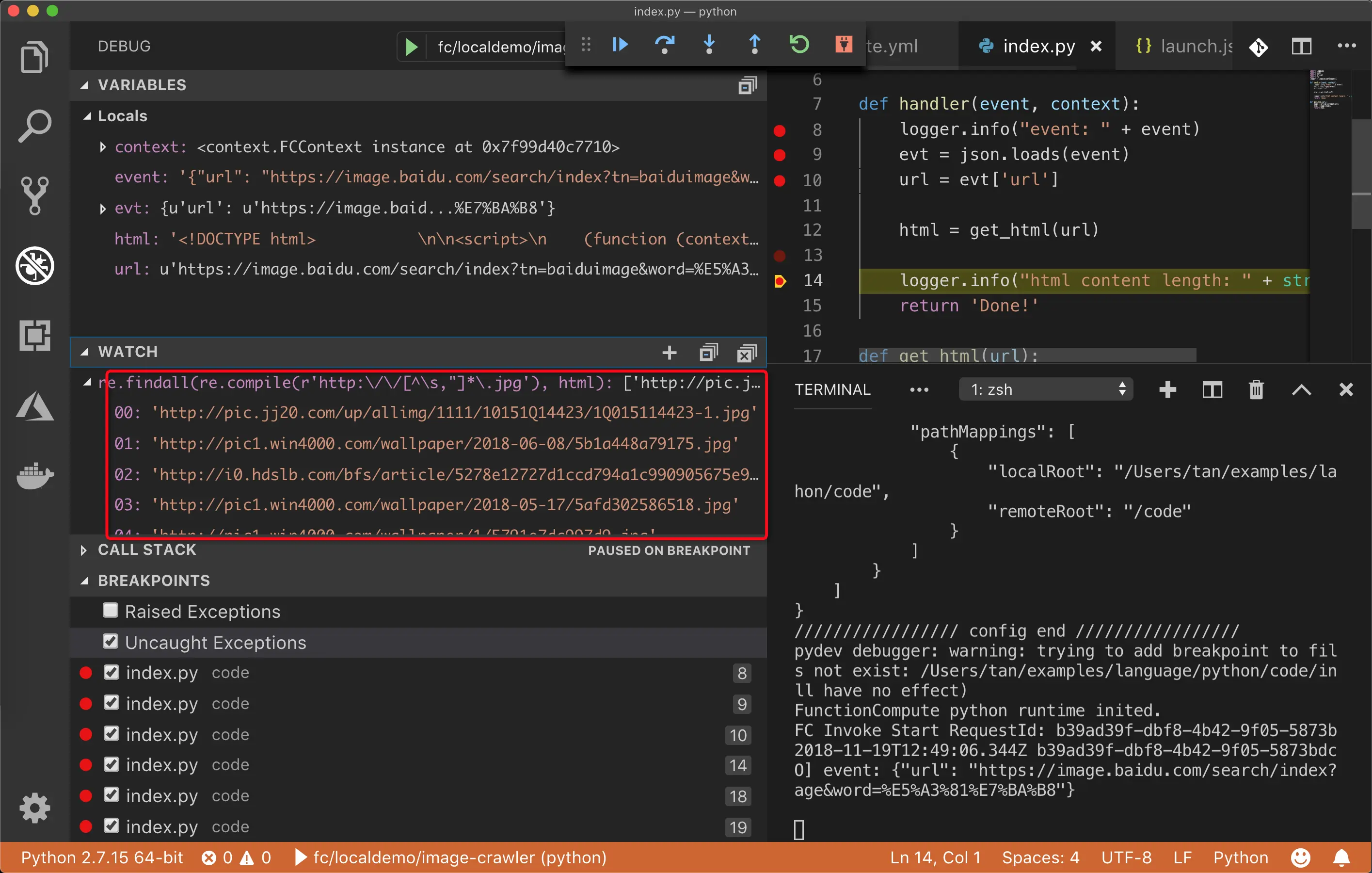 我们打算通过正则解析网页中包含的 jpg 图片,因此这一步会比较繁琐,因为涉及到正则表达式的微调。为了能快速的解决问题,我们决定利用 fun local 提供的 local debugging 解决问题。local debugging 方法参考: 《函数计算本地运行与调试 - Fun Local 基本用法》。