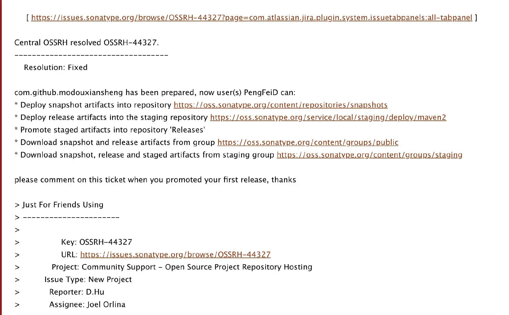 通知Sonatype构件已成功发布,在之前创建的Issue中回复一条The component has been successfully released通知工作人员为需要发布的构件做审批,发布后会关闭该Issue。