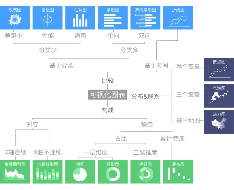 无论数据总量和复杂程度如何,数据间的关系大多可分为三类:比较 / 构成 / 分布&联系。