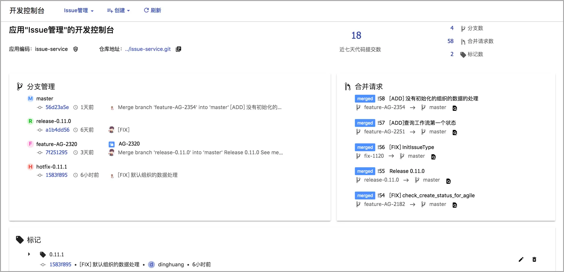 - Dashboard页面新增快速查看分支情况、代码提交情况、应用构建情况与部署情况的模块,并提供了快速跳转至相应模块的入口。