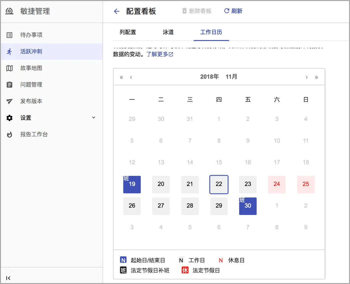- 新增时区日历功能:用户可以在组织层设置时区、节假日、工作日并应用在敏捷管理中。在开启冲刺选择日期的时候,可以勾选当前冲刺期间的工作日与非工作日。