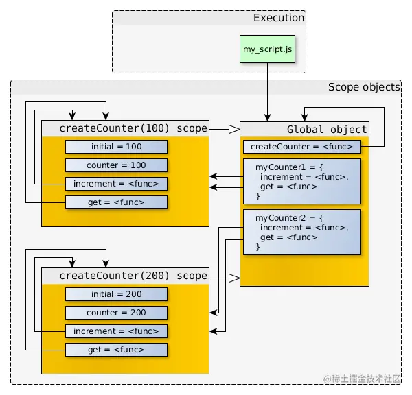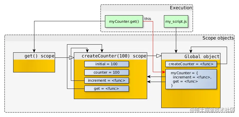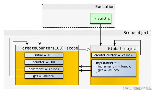 但是createCounter(100)实际上是有返回值的,并且返回值被存储在了myCounter中,所以对象之间的引用关系如下图: