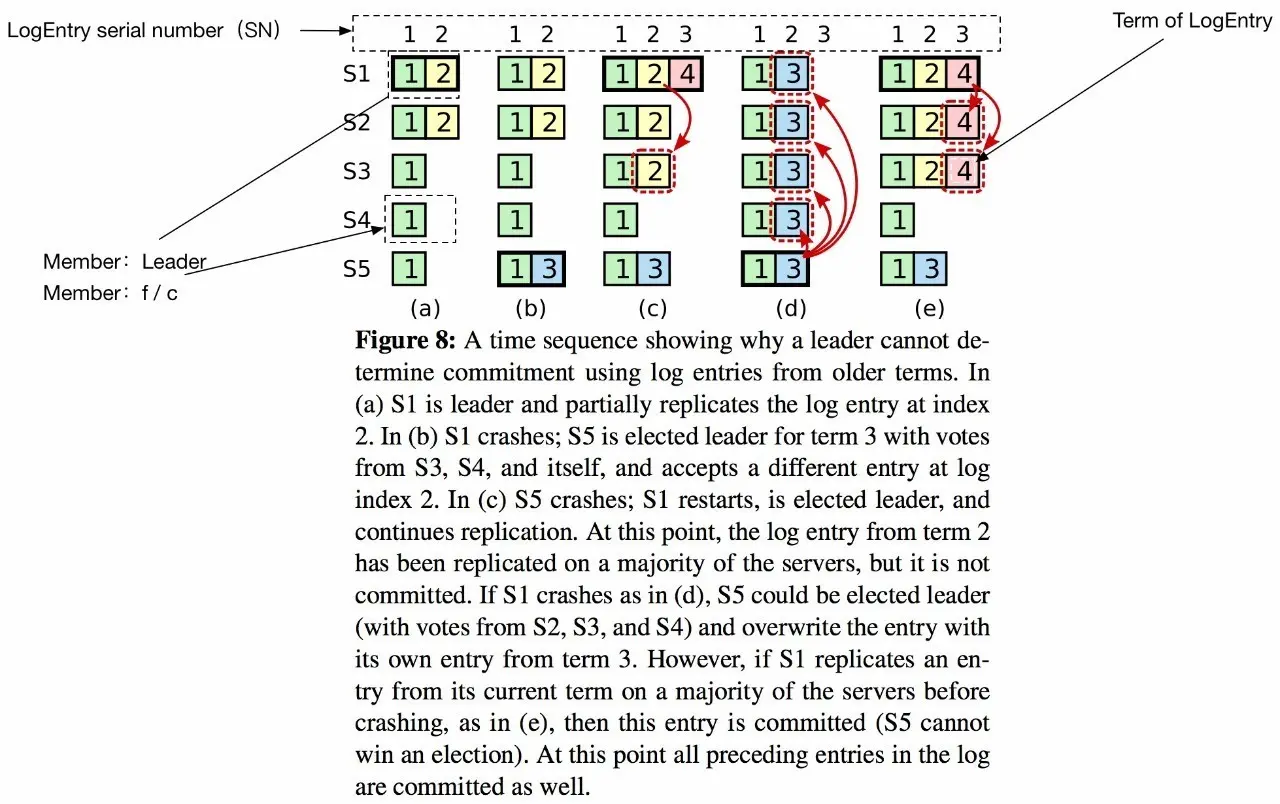 如图所示 (c) 状态 Term2 的 LogEntry(黄色) 只有在 (e)状态 Term4 的 LogEntry(红色)被 commit 才能够提交。