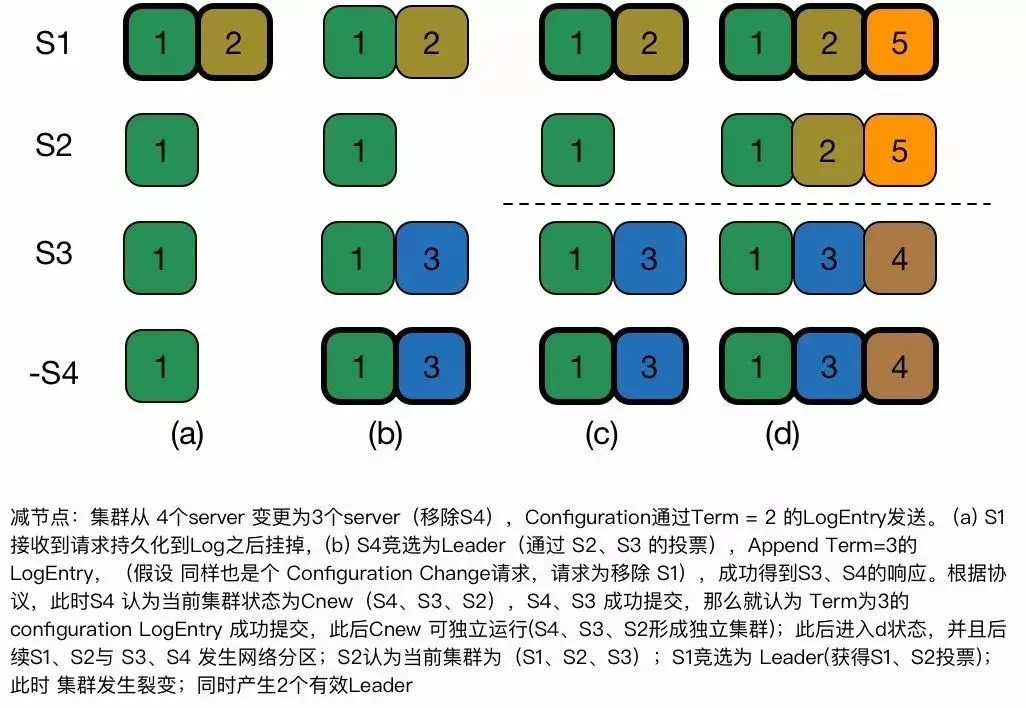 一方面是可用性方面的考虑,如下所示:Leader S1 接收到集群变更请求将集群状态从(S1、S2、S3、S4)变更为 (S2、S3、S4);提交到所有节点之后 commit 之后,返回客户端集群状态变更完成(如下状态 a),S1 退出(如下状态b);由于 Basic Raft 并不需要 commit 消息实施传递到其他 S1、S2、S3 节点,S1 退出之后,S1、S2、S3 由于没有接收到 Leader S1 的心跳,导致进行选举,但是不幸的是 S4 故障退出。假设这个时候 S2、S3 由于 Single MemberShip Change LogEntry 没有 Commit 还是以(S1、S2、S3、S4)作为集群状态,那么集群没法继续工作。但是实质上在(b)状态 S1 返回客户端集群状态变更请求完成之后,实质上是认为可独立进入正常状态。